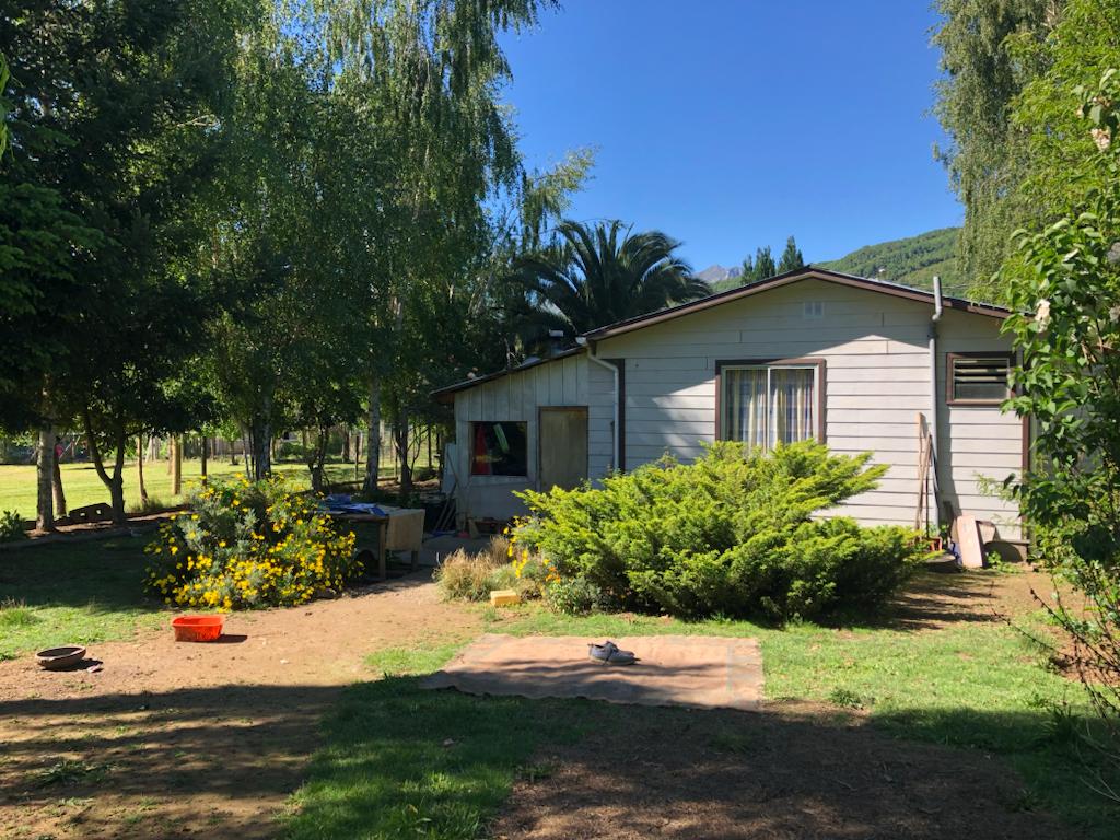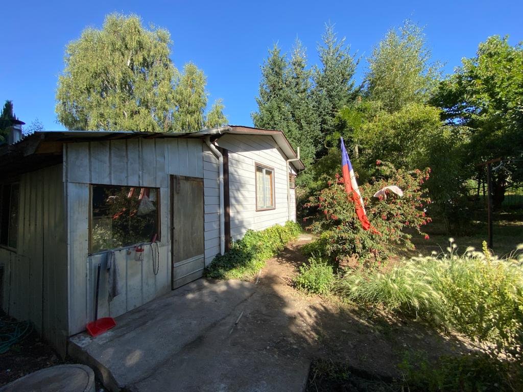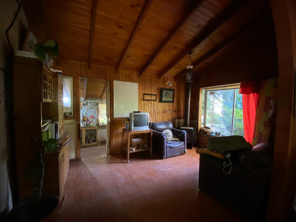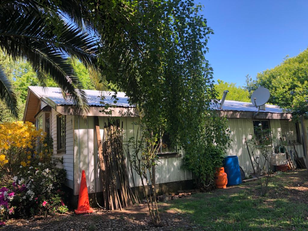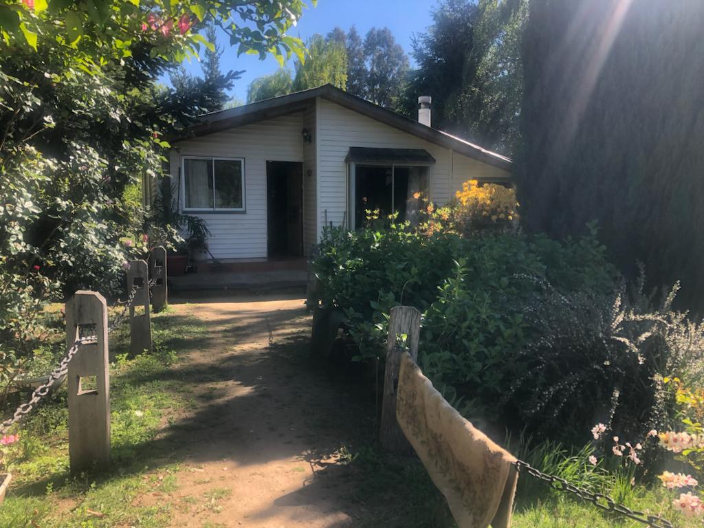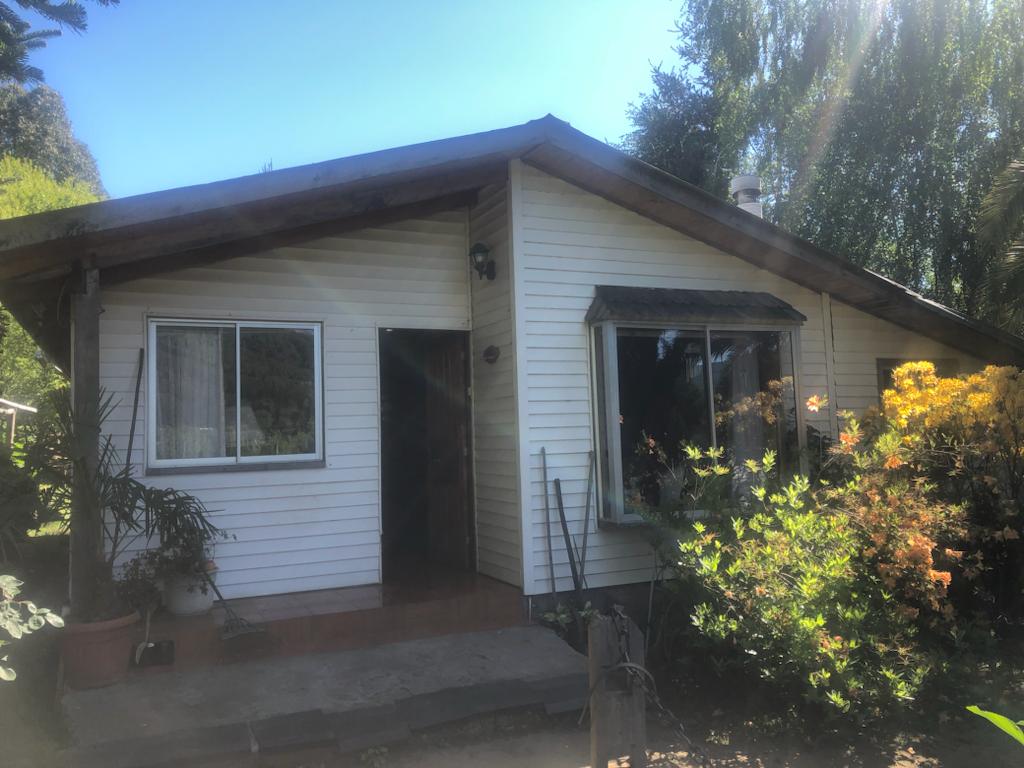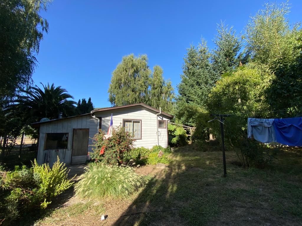 Casa de madera con 2 dormitorios, 2 baños, cocina comedor, living, gran patio con muchos árboles frutales y ornamentales.